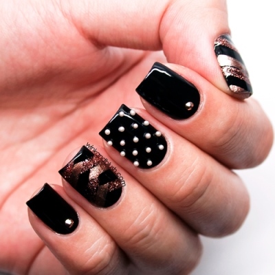 Rose Gold & Black Nail Art With Bullion Beads